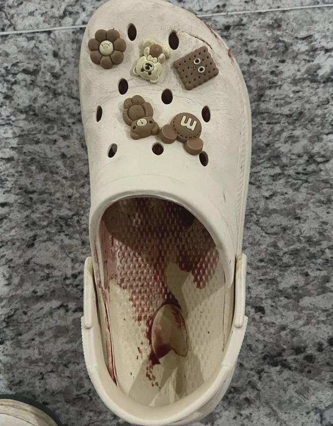 随后,孙先生拍下玻璃瓶残渣照片,发现瓶中液体几乎用完,他立刻打110报警,警察同时询问要不要拨打120,孙先生同意。“这时我将老婆的鞋子脱下,发现右脚第三根脚趾已经断了一截,趾头直接没了,只剩侧面小部分皮肤;第四根脚趾上半截几乎被砸烂,骨头清晰可见,肉就像被菜刀拍过的李子。”