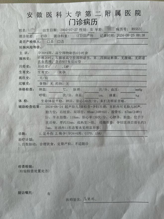 处理完伤口后,因担心妻子腹中胎儿受到惊吓,妻子被马上转送到安徽医科大学第二附属医院妇产科,进行B超检查和胎心监护。病历显示,主诉孕34+4周,高空掷物砸伤4小时余。