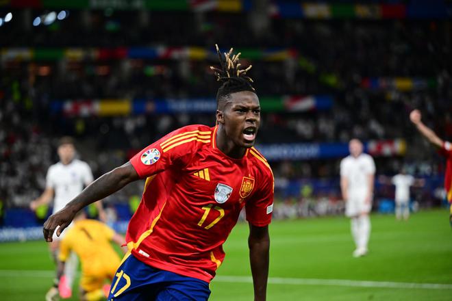 尼科·威廉斯在第47分钟接到亚马尔的传球,冷静推射为西班牙队先拔头筹